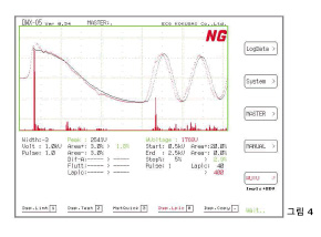 기억되어있는 마스터파형과 샘플파형을 간이적으로 겹쳐서 표시 할 수 있으며,이 화면에서 2 개의 제품의 특성의 차이를 쉽게 알 수 있습니다。