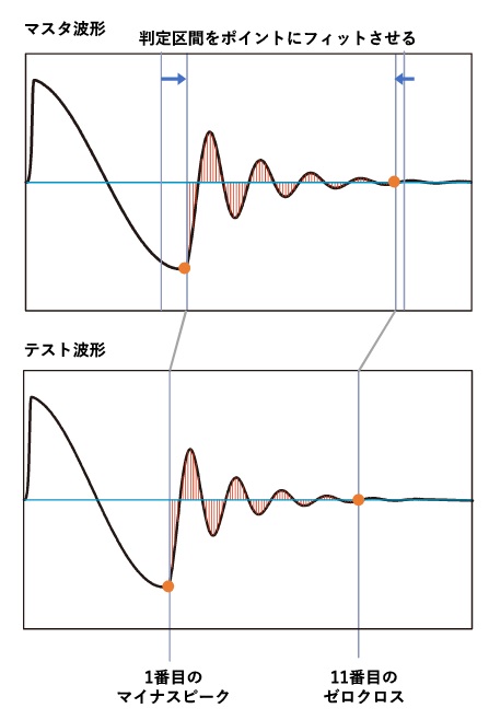 Qdmp試験では、マスタ波形のL/Rで決めたゼロクロスポイントやピーク電圧ポイントと同じ位置をテスト波形側でも自動で検出し、判定区間をマスタと同じ条件へ合わせます。これにより、1次ピークでズレがあっても後続波形が一致していれば、正しく良品判定を行うことができます。