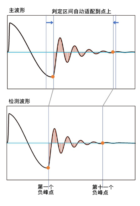 在 Qdmp 测试中,系统会自动检测测试波形中与主波形的 L/R(左/右)确定的零交叉点和峰值电压点相同的位置,并将判定区间调整至与主波形相同的条件。这样一来,即使峰值出现偏移,只要后续波形能够匹配一致,系统仍然可以正确地进行良品判定。